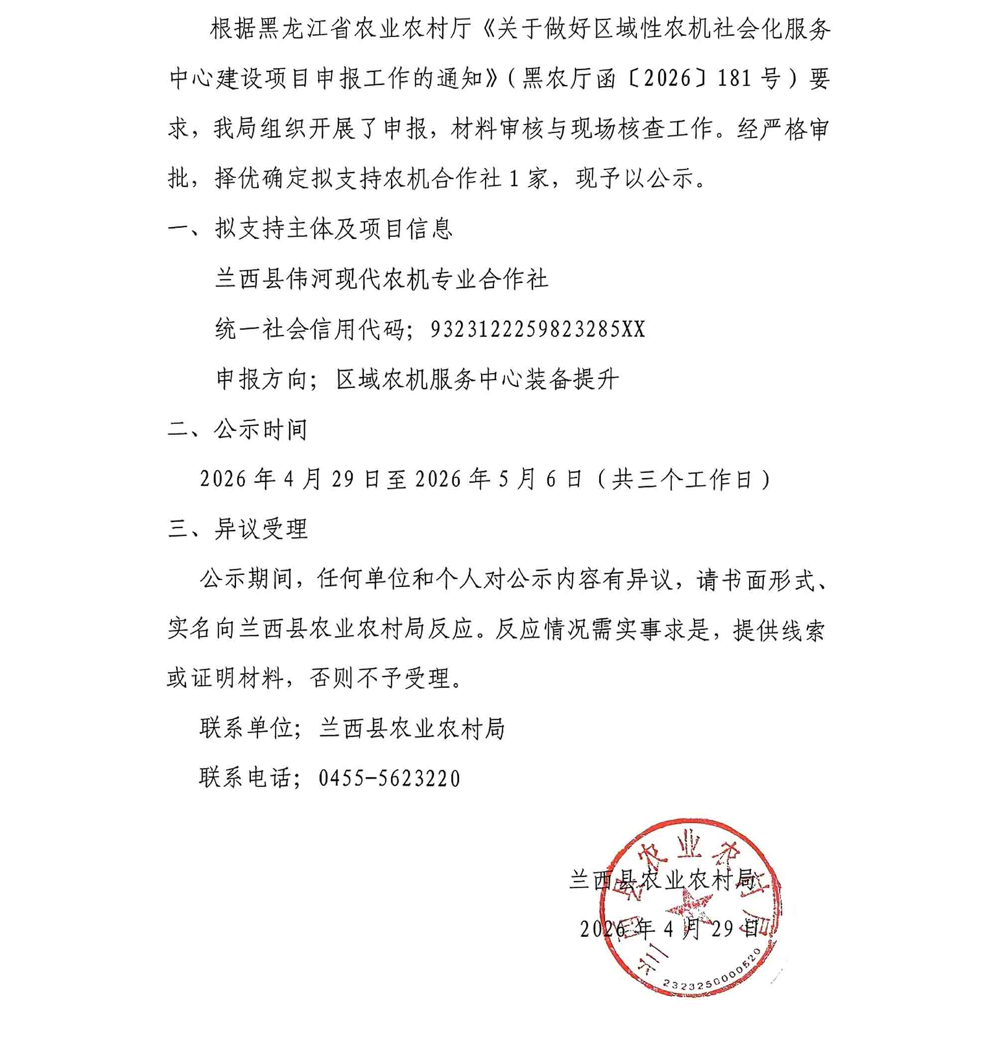 区域性农机社会化服务中心建设项目拟支持对象公示