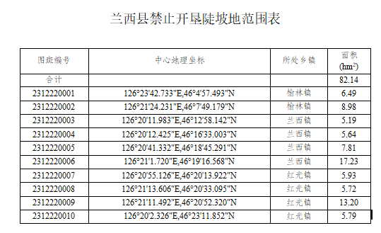 按照《中华人民共和国水土保持法》第二十条和《黑龙江省水土保持条例》第二十一条规定,和《水利部关于加强水土保持空间管控的意见》(水保〔2024〕4号)要求,现对我县禁止开垦陡坡地范围划定成果予以公告: